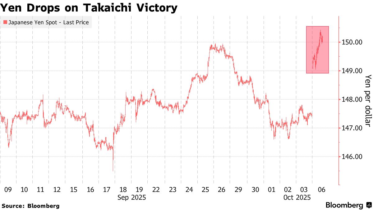 高市早苗胜选的导致日元兑美元汇率周一大跌多达2%,而日本国债则因市场担忧高市早苗将推出更多政府支出并推升通胀而下挫。许多市场参与者也注意到,她此前曾批评日本央行加息的举动,若上任可能会主张放缓政策紧缩步伐。