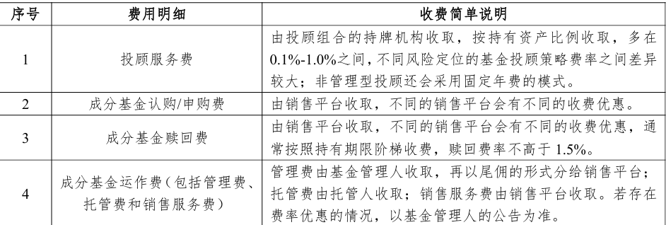 对于投资者来说,若在某个平台上购买了基金投顾策略,涉及的费用包括投顾服务费、成分基金交易费用、成分基金运营费用。
