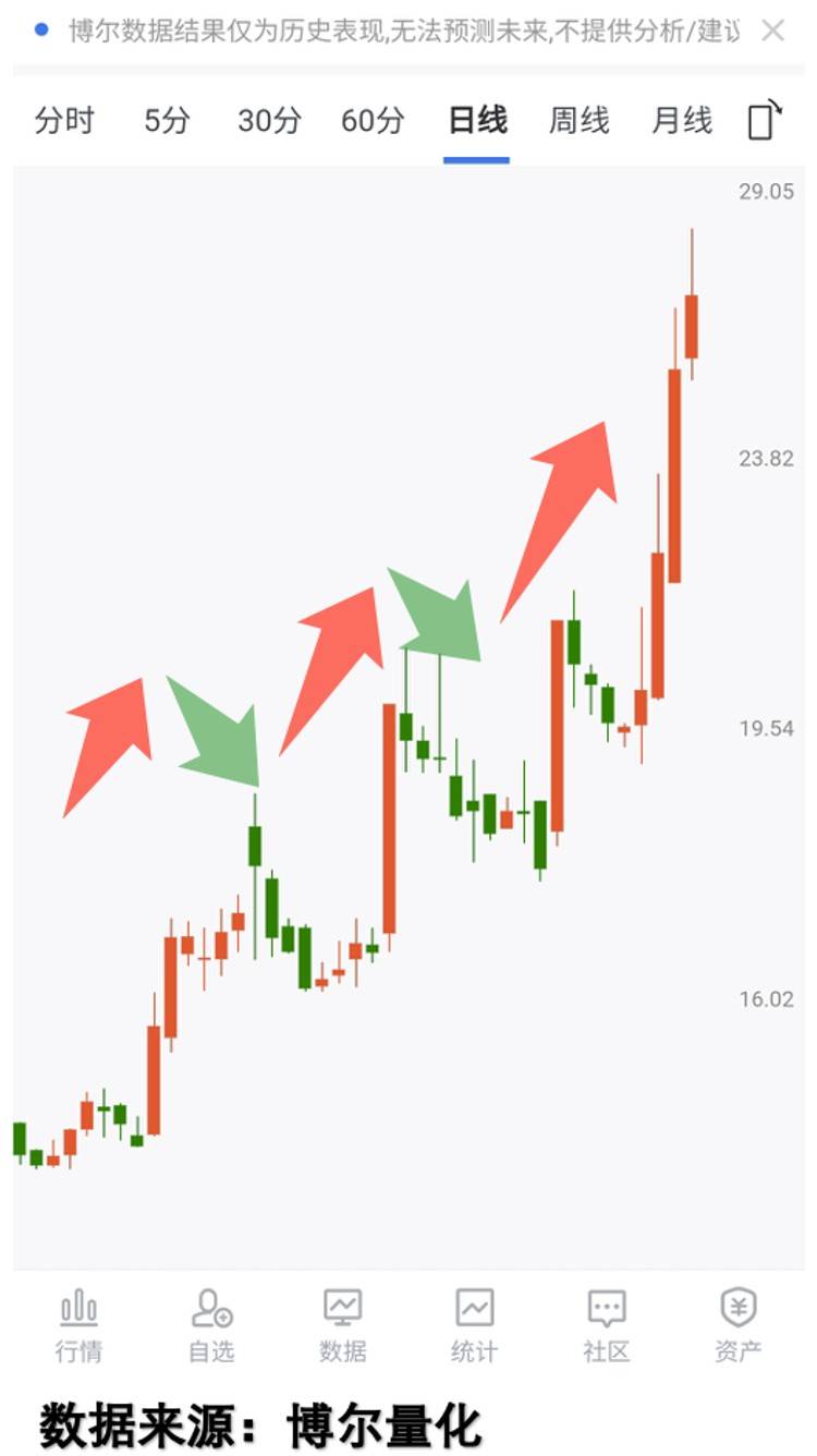 其实这种情况,用“交易行为数据”一看就明白。比如下面这只股票(看图1),回头看是妥妥的“牛股”,但过程中震荡得让人“心脏疼”:涨两天、跌三天,反弹力度弱,谁看了都怕。要是你当时持有,大概率会卖飞——这就是“马后炮”的无奈:回头看什么都懂,当时看全是“未知数”。