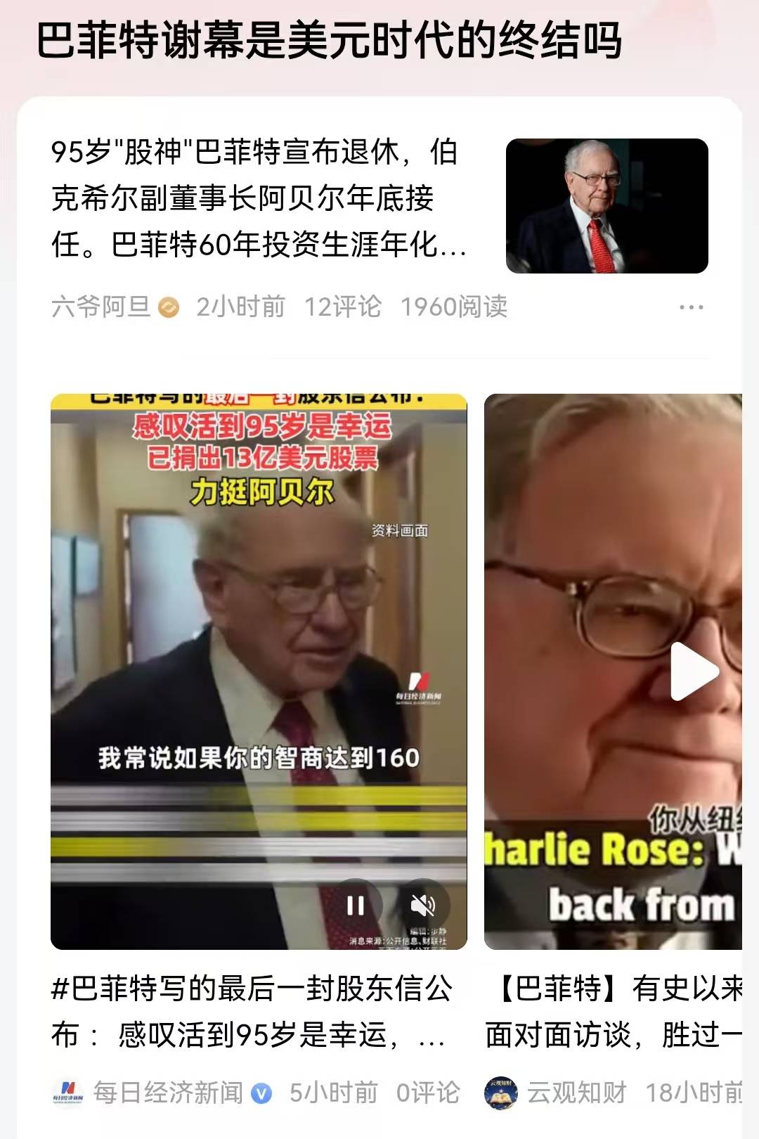 在公开退休信中,他也是大方的承认运气,与一个人的成功有着很大的关联。其中巴菲特还专门谈到了运气,其中包含健康、性别、出生地等等,其实有着成功的非公平影响。巴菲特尤其特别感恩美国机遇,有人疑问,巴菲特谢幕是美元时代的终结吗?有可能还不一定意味着美元时代的终结,但是美元最辉煌的时代肯定是过去了,尤其是近三年多,黄金价格的一路上涨,已经在说明,美元在衰落。