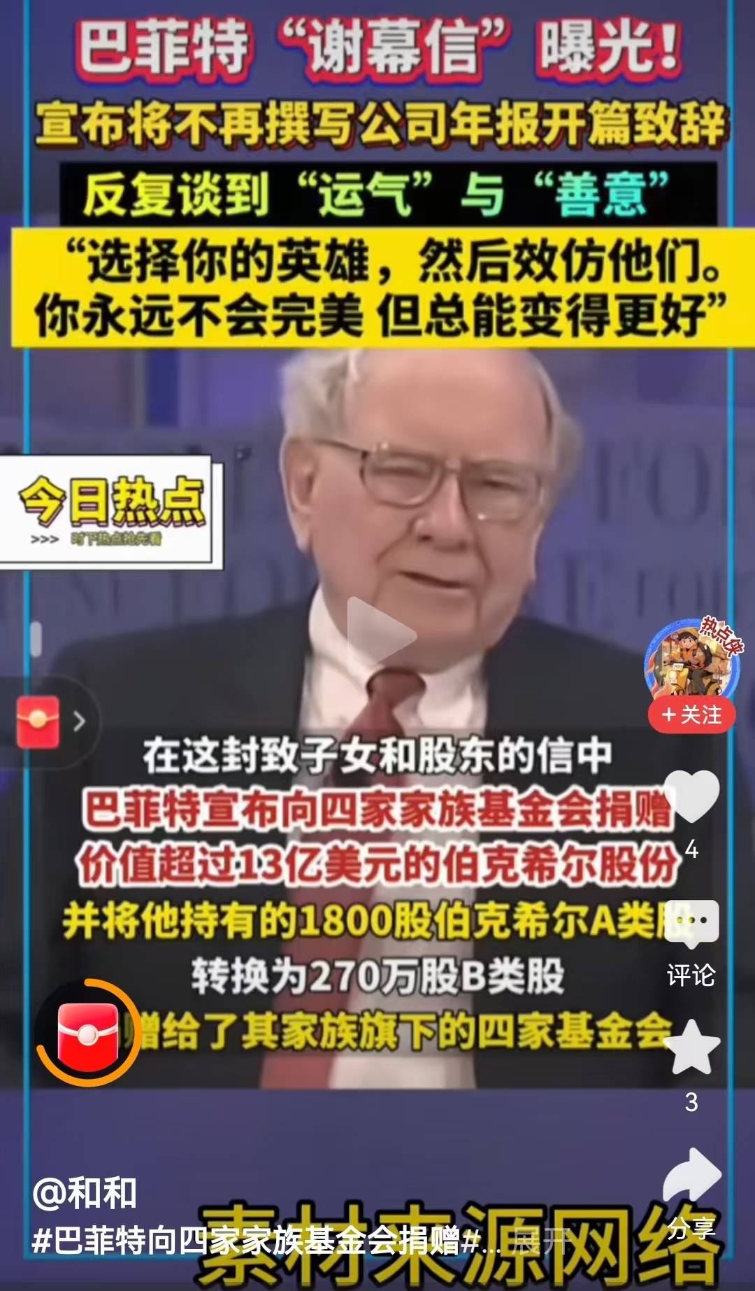 巴菲特也特别表明他不会出售伯克希尔哈撒韦公司的股份,这主要是让投资者放心,但是他会加快向子女基金会捐赠伯克希尔股票。在之前,巴菲特明确表达,将99.5%的财产交付于家族慈善基金,而只给自己的三个子女留下总财富的0.5%。不过基金会有着独立受托人,在一定程度上,即使不给家族留下0.5%,有可能基金会仍然会持续供养家族,就如洛克菲勒基金会一样。