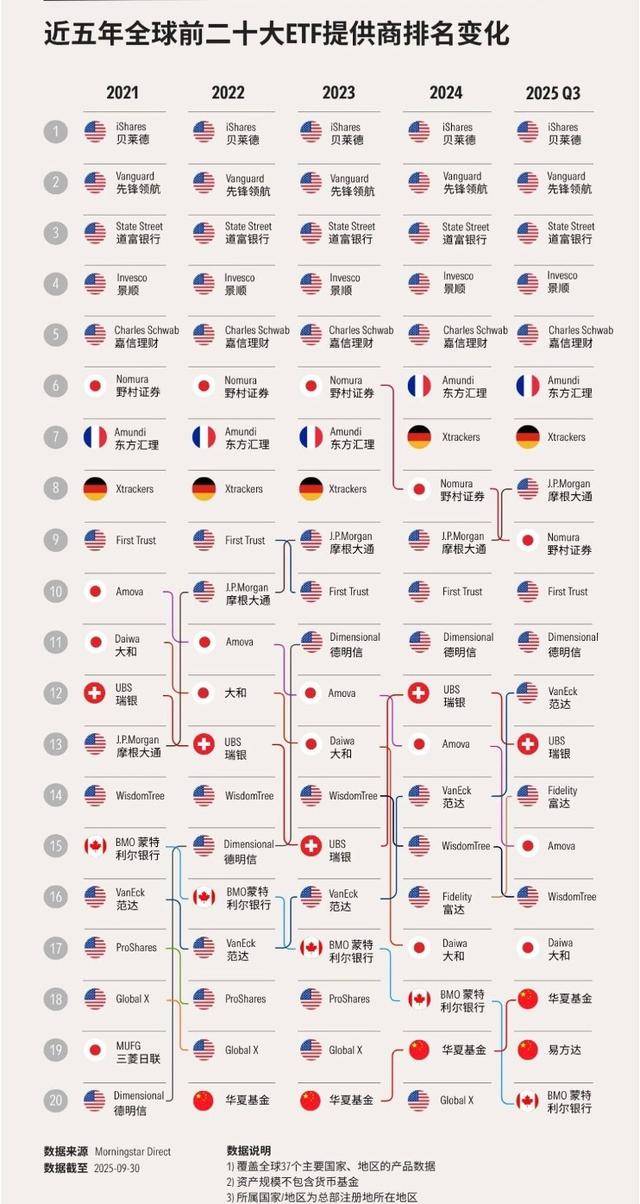 晨星此前公布了2025年三季度全球前20大ETF提供商排名出炉。中国头部基金公司位次进步明显。截至2025年三季度,华夏基金ETF管理规模达1268亿美元,排位进一步提高到第18。自从华夏基金2022年成为我国首家跻身全球20强的ETF提供商,2024年、2025年连续两年排位跃升。此外,易方达基金的身影也出现在2025年三季度的榜单上,位于第19位。