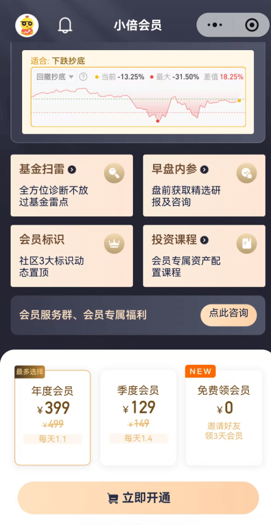不过,基民若想查询自己基金的实时估值涨跌,则需要开通会员。付费开通会员后,投资者还可以获得基金扫雷、早盘内参、涨跌信号等多项服务。