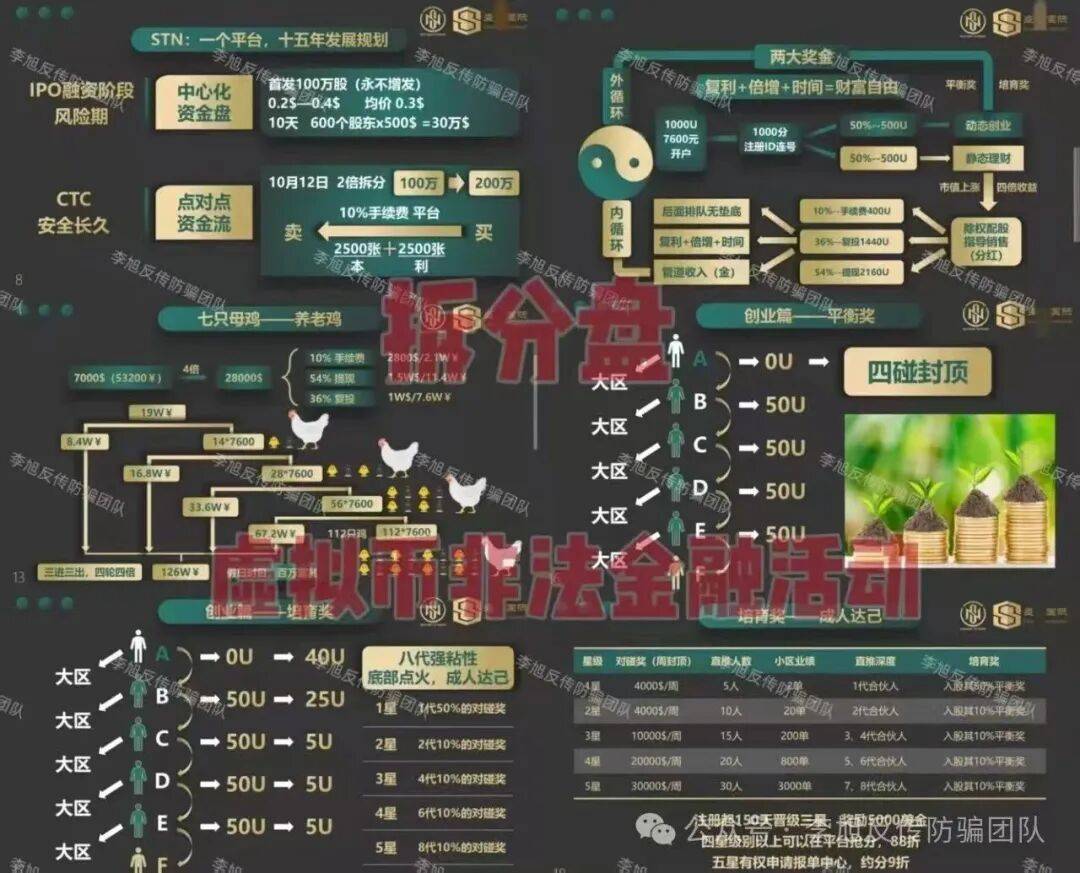 STN未经批准,以“数字资产理财”“拆分”为名,承诺高额回报,向社会公众吸收资金,涉嫌非法集资。通过传销模式进行扩张,本质是用后入资金兑现前入承诺,属于典型的庞氏骗局。
