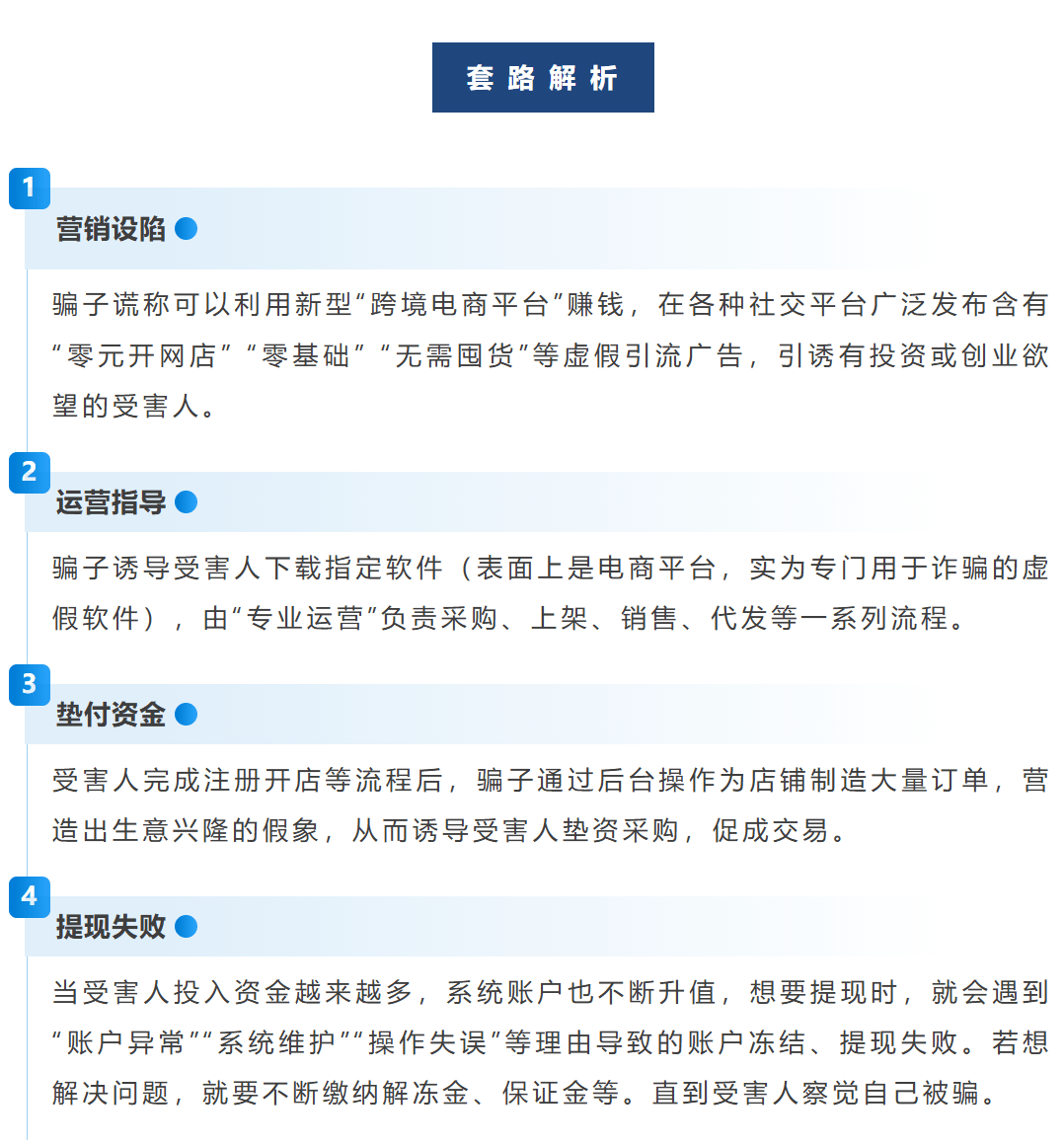此类骗局通常会利用“跨境电商”旗号,在各种社交平台发布所谓 “零元开网店”等虚假引流广告,吸引参与者,随后诱导用户下载专门制作的假冒软件,号称由“专业运营”负责采购、上架、销售、代发等一系列流程。待用户完成注册后,平台通过后台操作为制造大量订单,诱导参与者不断垫资。当投入资金越来越多,想要提现时,就会遇到各种问题导致提现失败。或者店主无力支付源源不断的订单款,出现违约行为,对方即可在骗局解冻金、保证金等等。