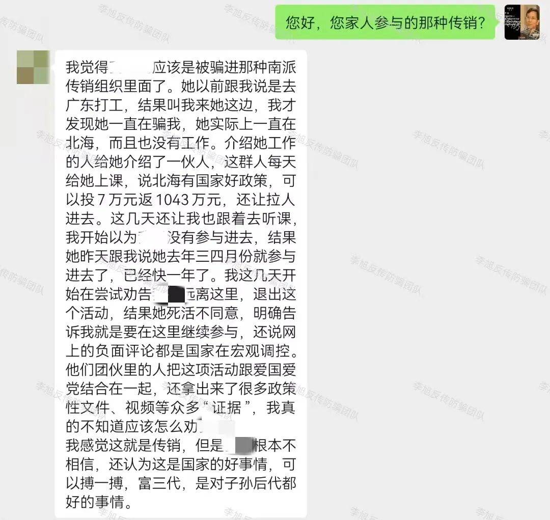 该组织通常以“投资北部湾、国家项目”等旗号诱骗新人,利用各种歪曲解读的政策性文件、地标建筑等迷惑新人,宣称投资1份3800元、21份7万元,出局可赚1040万元。