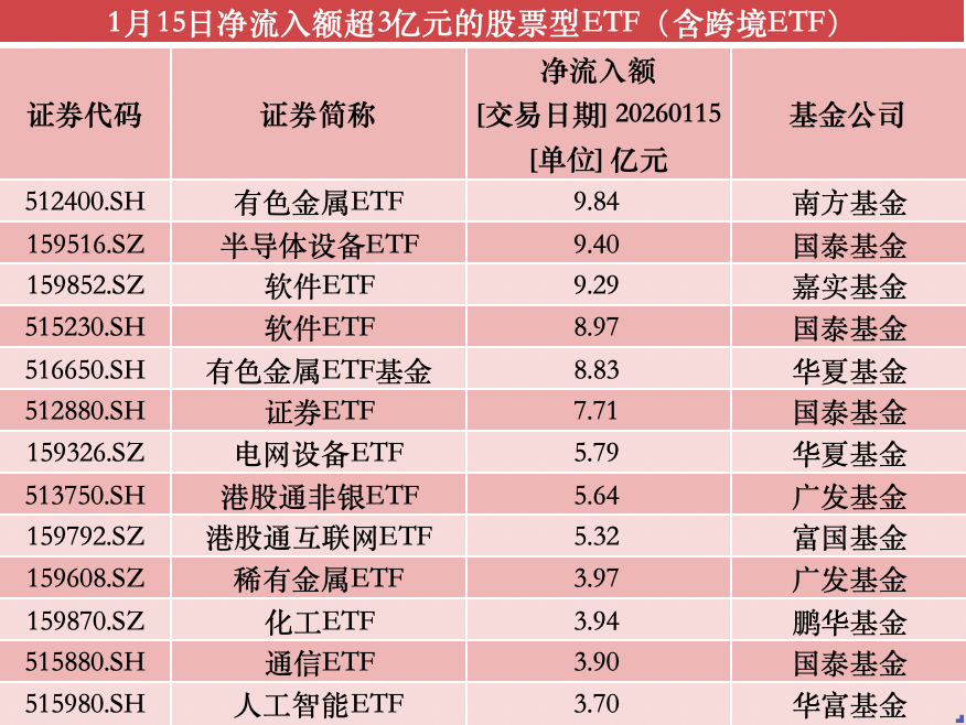 具体产品方面,南方有色金属ETF以9.84亿元的净流入额位居榜首;国泰半导体设备ETF、嘉实软件ETF紧随其后,单日净流入额分别达9.40亿元、9.29亿元;国泰软件ETF、华夏有色金属ETF也分别录得8.97亿元、8.83亿元净流入。