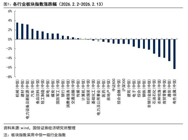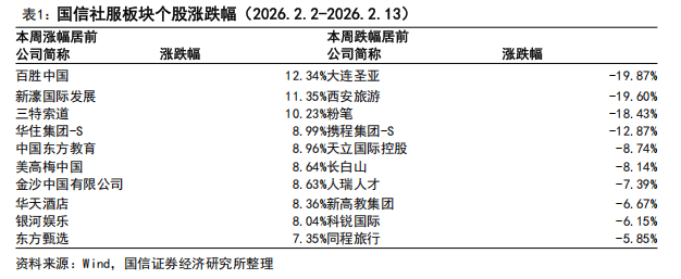 报告期内(2026年2月2日-2026年2月13日),国信社服板块涨幅居前的股票为百胜中国(12.34%)、新濠国际发展(11.35%)、三特索道(10.23%)、华住集团-S(8.99%)、中国东方教育(8.96%)、美高梅中国、金沙中国有限公司、华天酒店、银河娱乐、东方甄选。国信社服板块跌幅居前的股票为大连圣亚(-19.87%)、西安旅游(-19.60%)、粉笔(-18.43%)、携程集团-S(-12.87%)、天立国际控股(-8.74%)、长白山、人瑞人才、新高教集团、科锐国际、同程旅行、中国中免、新高教集团。