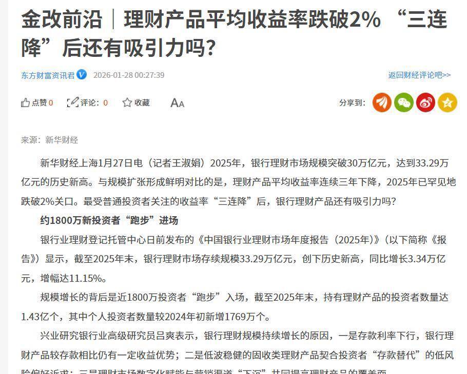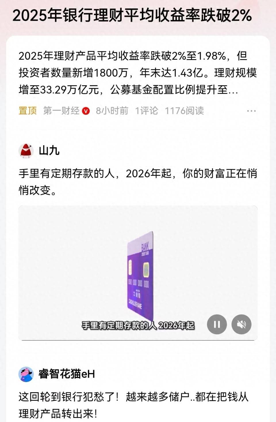 规模增长了,说明理财者投入的兴趣增加了,但是奇怪的是,收益率却是三年连降,这才是反常识的数据呢!银行理财产品平均收益率在2023年为2.94%、2024年为2.65%、但是到了2025年仅仅只剩下1.98%。普通理财者真可怜!收益率下降但是闲钱还是无处可去,还只能投入理财产品中。觉得银行售卖的理财产品安全性可能会更好,收益低一些也忍了!