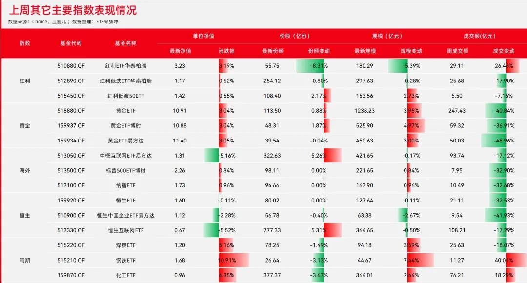红利和黄金等避险板块上周也很强,红利ETF华泰柏瑞和黄金ETF上周涨幅均超3%,伊朗局势逐渐升温,部分资金转向避险板块,今天红利和黄金板块双双延续大涨趋势。