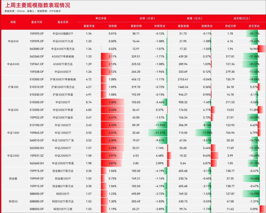 主要规模指数基金净值涨但份额下跌成为一大特点。除了追踪中证500指数的中证500ETF华夏和追踪中证2000的三只ETF,其余基金份额都在缩水。资金选择止盈离场,市场观望情绪较浓。