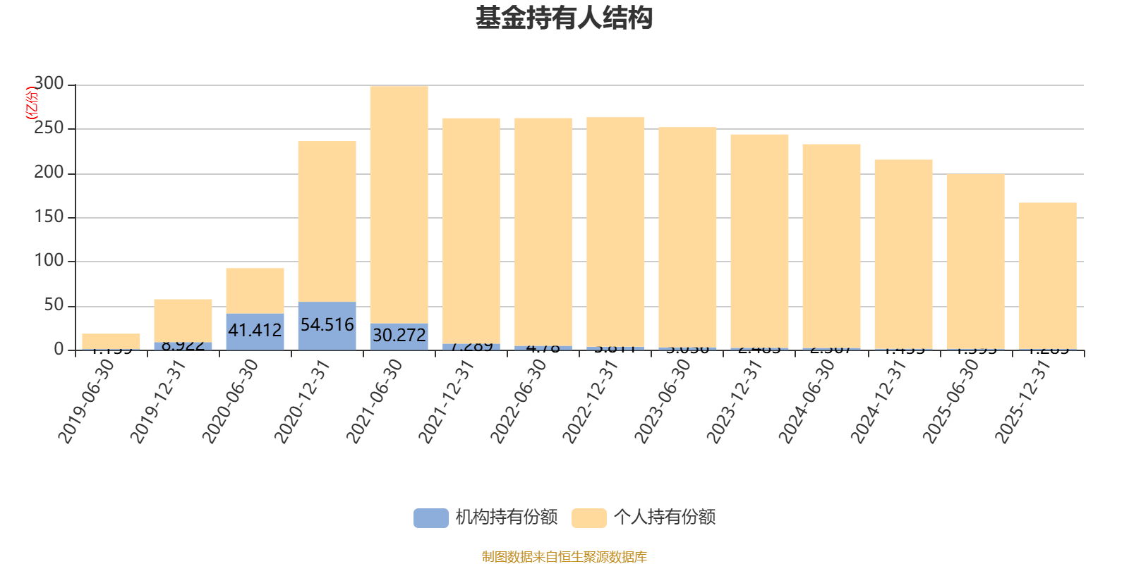 截至2025年12月31日,基金持有人共计265.09万户,合计持有166.57亿份。其中管理人员工持有1601.49万份,占比0.10%,机构持有份额占比0.77%,个人投资者占比99.23%。