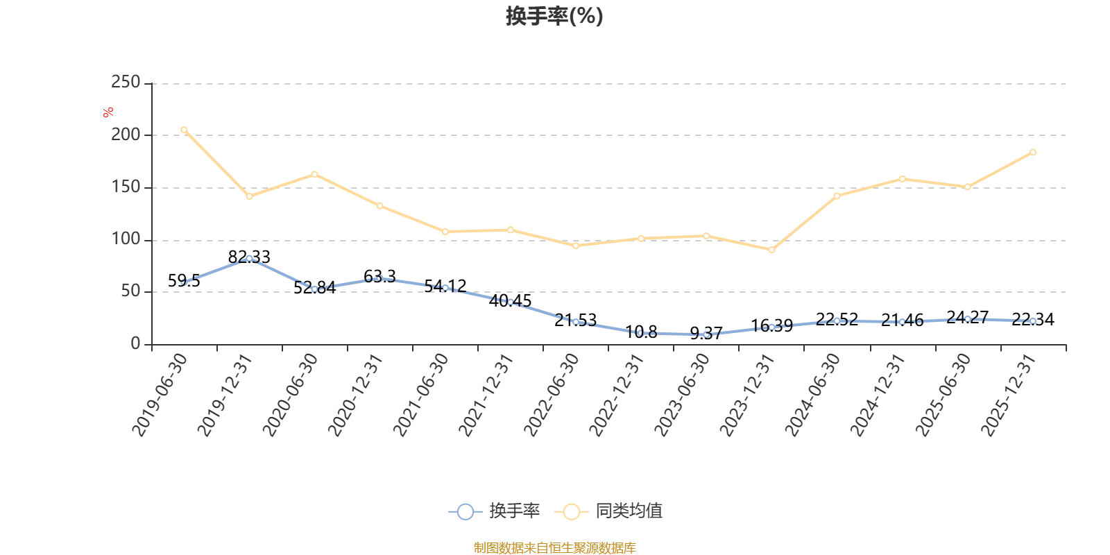 截至2025年12月31日,基金最近一年换手率约46.46%,持续低于同类均值。