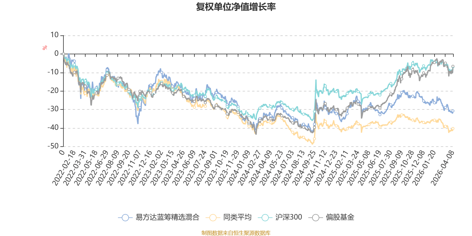 截至4月8日,易方达蓝筹精选混合近三个月复权单位净值增长率为-5.75%,位于同类可比基金34/85;近半年复权单位净值增长率为-12.58%,位于同类可比基金55/85;近一年复权单位净值增长率为1.72%,位于同类可比基金38/85;近三年复权单位净值增长率为-17.24%,位于同类可比基金29/76。