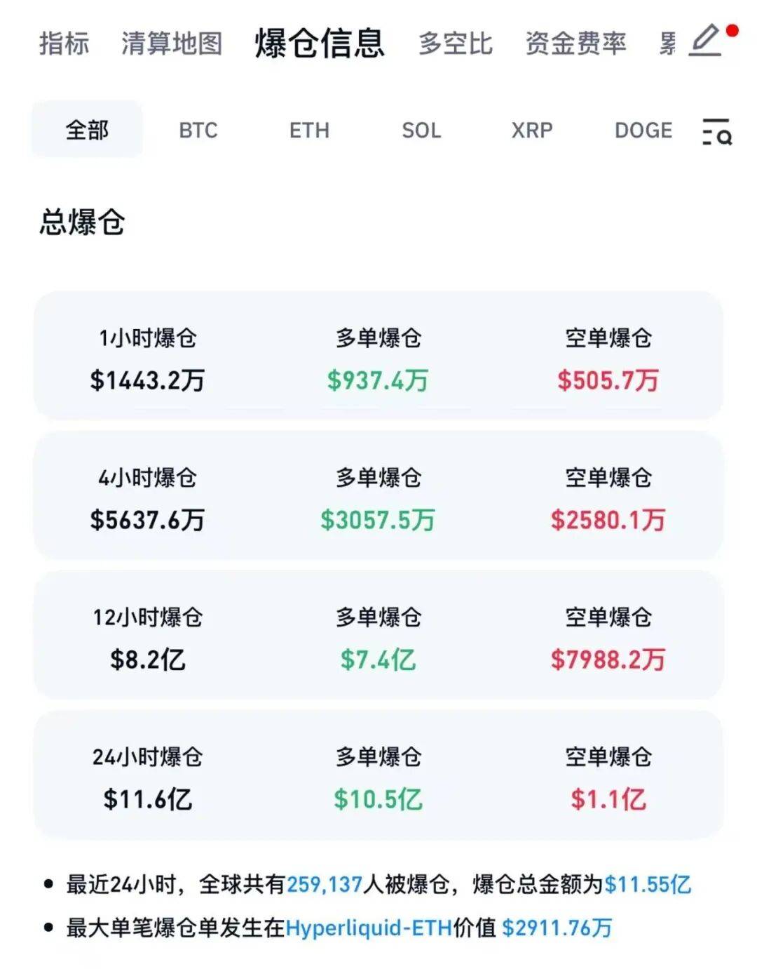 根据Coinglass数据,近24小时全球共有超过25万人被爆仓,爆仓总金额达11.55亿美元。