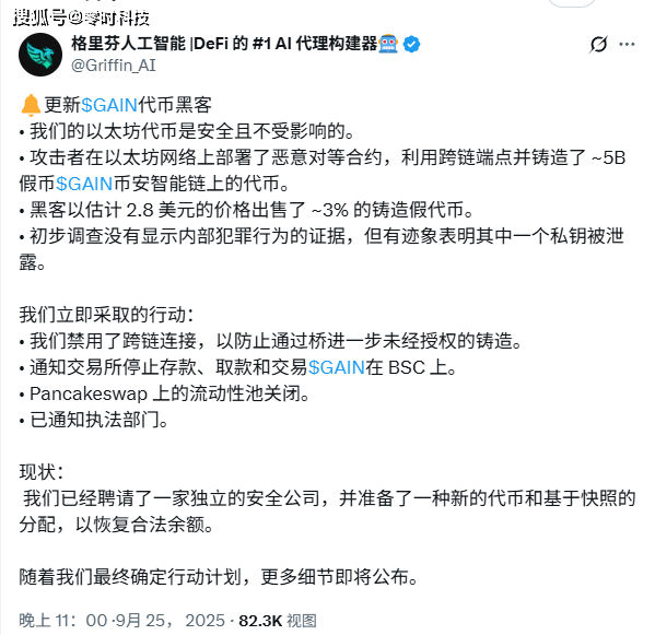 事件详情:9月25日,GriffinAI 代币 GAIN 因 LayerZero 跨链协议漏洞遭攻击,黑客通过伪造以太坊合约节点,非法增发 50 亿枚 GAIN 代币抛售,1 小时内价格从 0.163 美元跌至 0.003 美元,暴跌 98%。黑客将赃款兑换为 BNB 后跨链转入以太坊,最终流向 Tornado Cash 混币平台。截至 9 月 30 日,GriffinAI 官方未披露平台直接资产损失,主流安全机构也未发布链上资金追踪的明确损失数据,但代币市值蒸发超 1.2 亿美元,且已有部分用户因价格产生实际亏损。