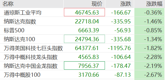 美股大型科技股全线大跌,英伟达、特斯拉、甲骨文、AMD大跌超3%,台积电ADR大跌超2%,谷歌、亚马逊、Meta跌超1%,苹果、博通小幅下挫。