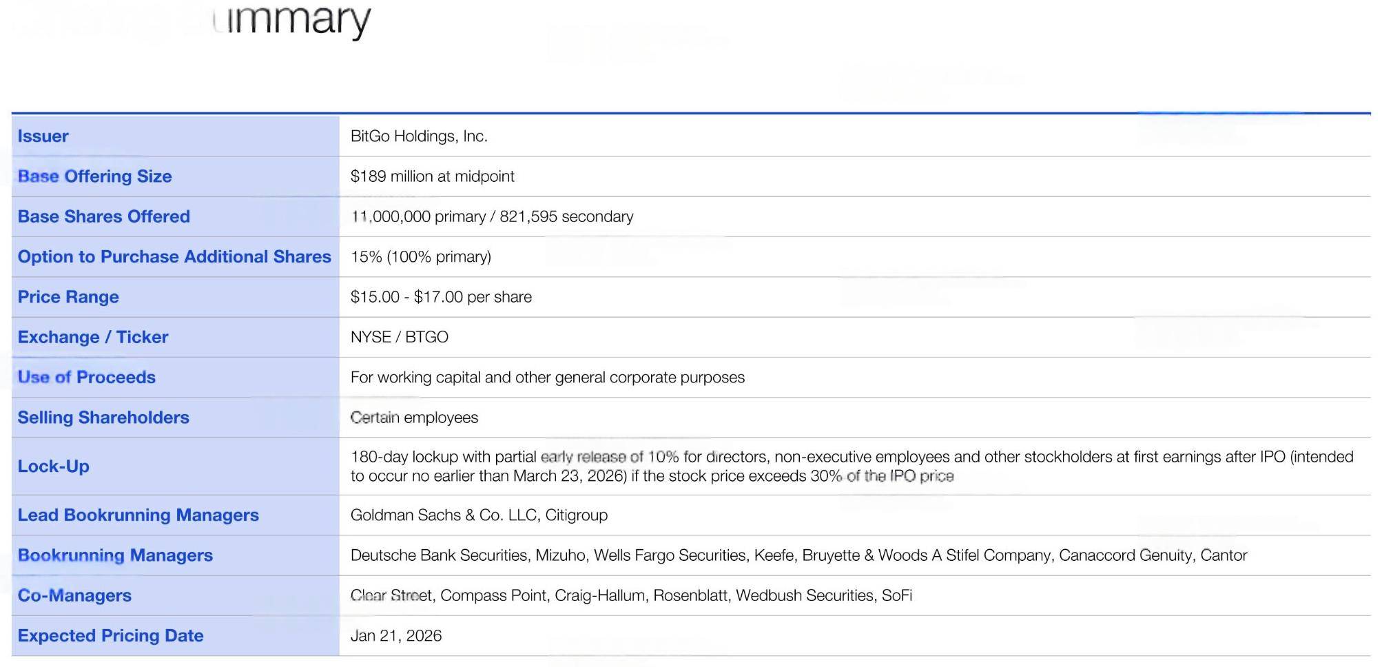 2026-01-13交易所,交易所排名,交易所排行,加密货币是什么,加密货币交易平台,加密货币平台,币安交易所,火币交易所,欧意交易所,Bybit,Coinbase,Bitget,Kraken,全球交易所排名,交易所排行加密货币托管初创企业BitGo(股票代码:“BTGO”)日前递交招股书,准备2026年1月22日在纽交所上市。