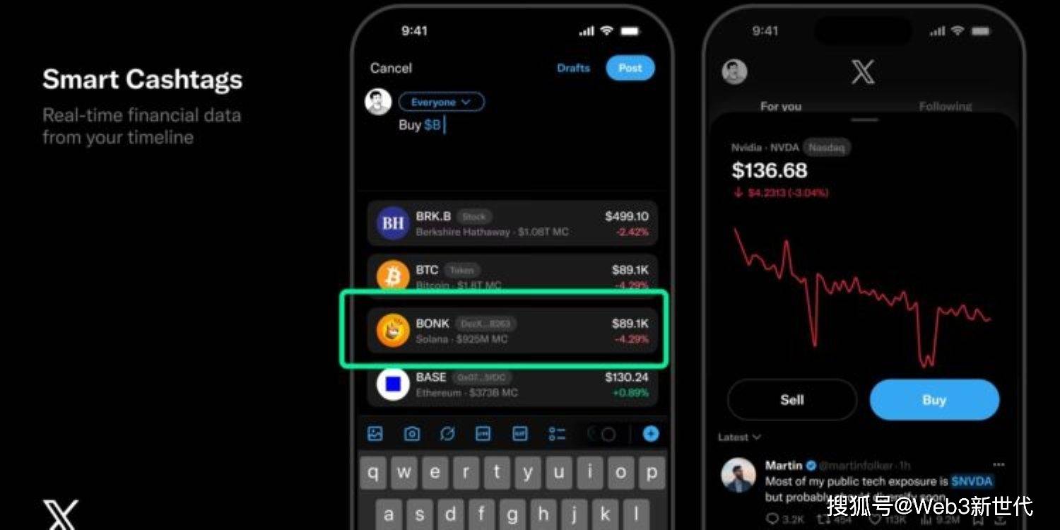 即将推出的 Smart Cashtags 看起来更具野心。流传的概念图显示在资产数据旁可能出现“买入”和“卖出”按钮,尽管 X 尚未确认这项功能在发布时是否会直接支持交易,也未说明此类交易将如何执行。