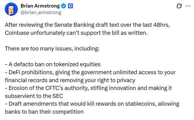 对于本周参议院公布的修正案文件,Coinbase首席执行官布莱恩·阿姆斯特朗今日凌晨发文表示,无法支持这份法案。