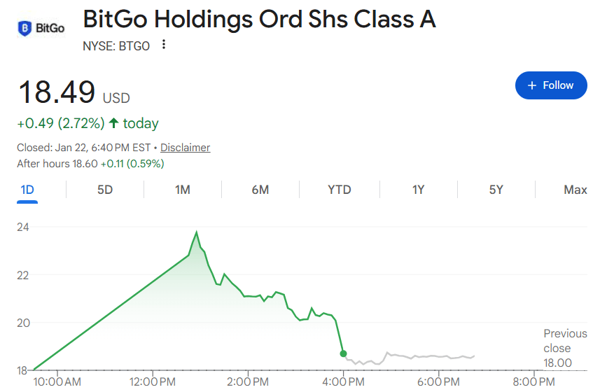 2026-01-24交易所,交易所排名,交易所排行,加密货币是什么,加密货币交易平台,加密货币平台,币安交易所,火币交易所,欧意交易所,Bybit,Coinbase,Bitget,Kraken,全球交易所排名,交易所排行1月22日,BitGo跳空高开22.43美元,收盘时微涨2.72%、回落至18.49美元。按收盘价计算,BitGo市值达21亿美元。