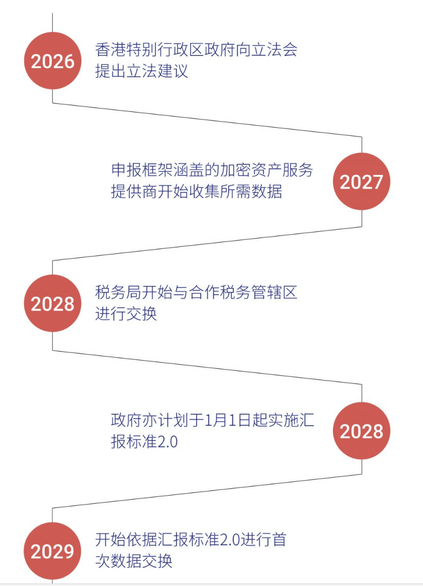 香港政府将于 2026 年向立法会提出立法建议,以便申报框架涵盖的加密资产服务提供商能够从 2027 年开始收集所需数据,供税务局从 2028 年开始与合作税务管辖区进行交换。政府亦计划于2028年1月1日起实施汇报标准2.0,并于2029年开始依据汇报标准2.0进行首次数据交换。政府已经于去年12月9日就相关文件开始公众咨询。