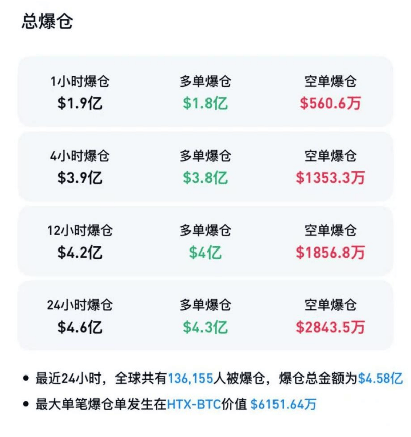 Coinglass数据显示,最近24小时内,加密货币市场超13万人被爆仓,爆仓总金额为4.58亿美元。其中,多单爆仓金额为4.3亿美元,空单爆仓金额为2843.5万美元。