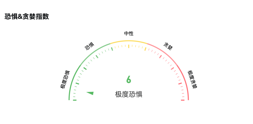 Coinglass数据显示,当前,加密货币“恐惧&贪婪指数”为6,较昨日下跌2个点,处于极度恐惧状态。