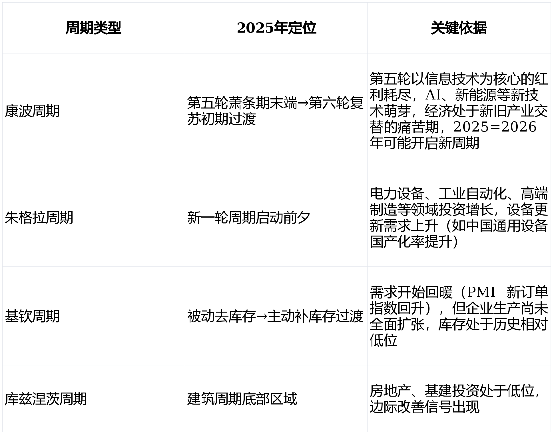 综上,经济周期理论的核心是揭示经济波动的规律与成因,而 2025 年的核心特征是 “多周期底部叠加、新旧周期交替”,整体处于低位区间,是布局下一轮复苏的关键窗口期。