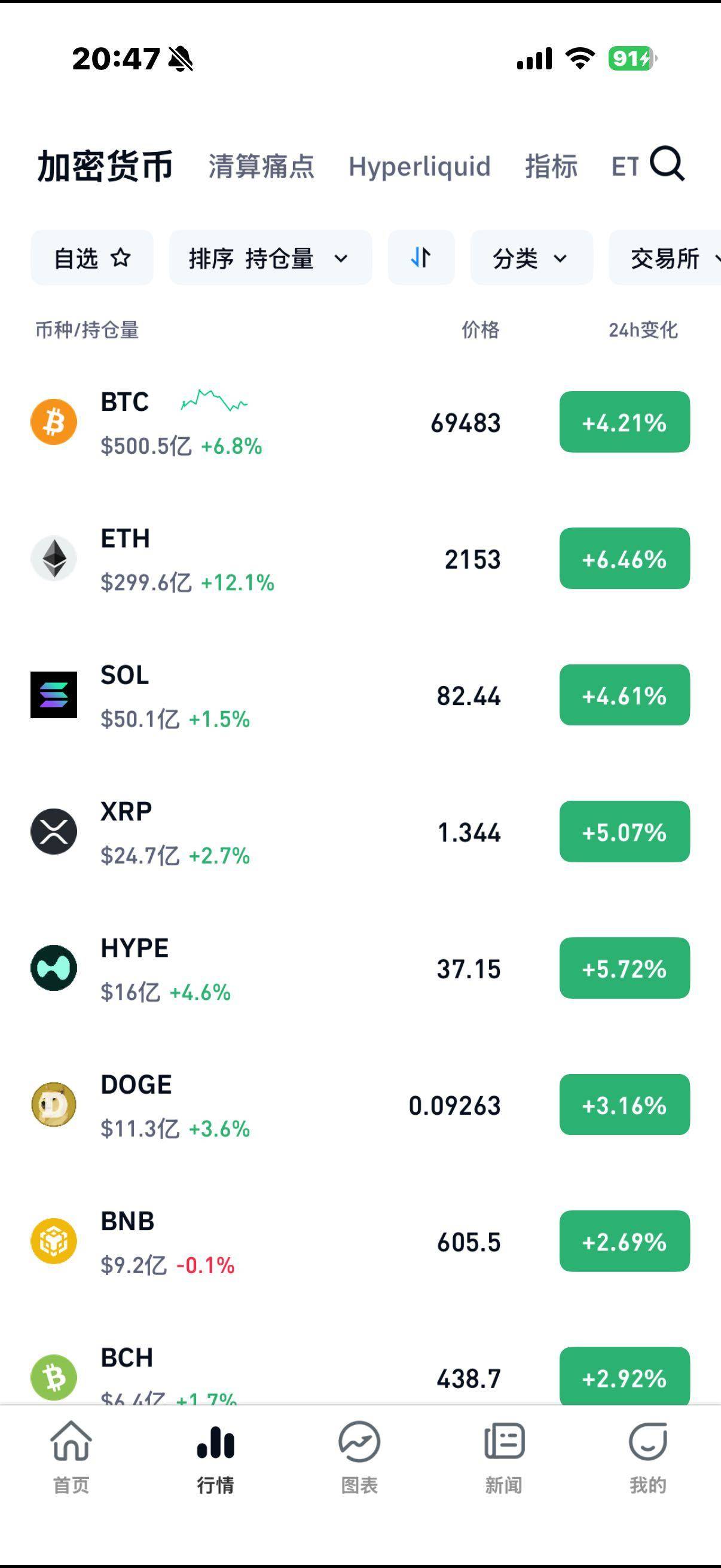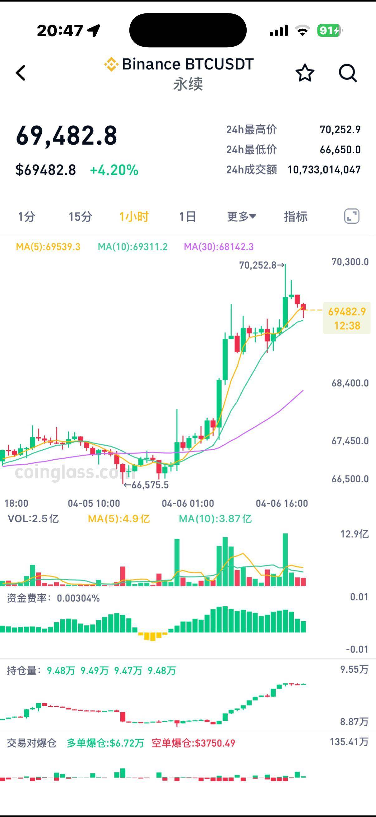 比特币目前报69482美元,上涨4.2%,以太坊大涨超6%,SOL币涨4.36%。