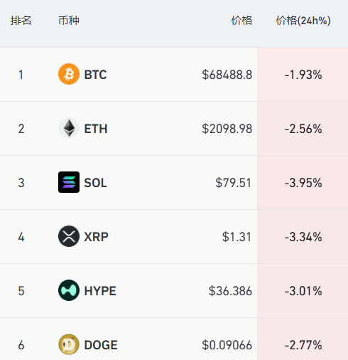 加密货币主要币种全线下挫,截至发稿,比特币跌破6.9万美元/枚,跌幅近2%,以太坊、SOL、XRP、狗狗币等下跌。据CoinGlass数据统计,过去24小时,全市场超7.5万人被爆仓。