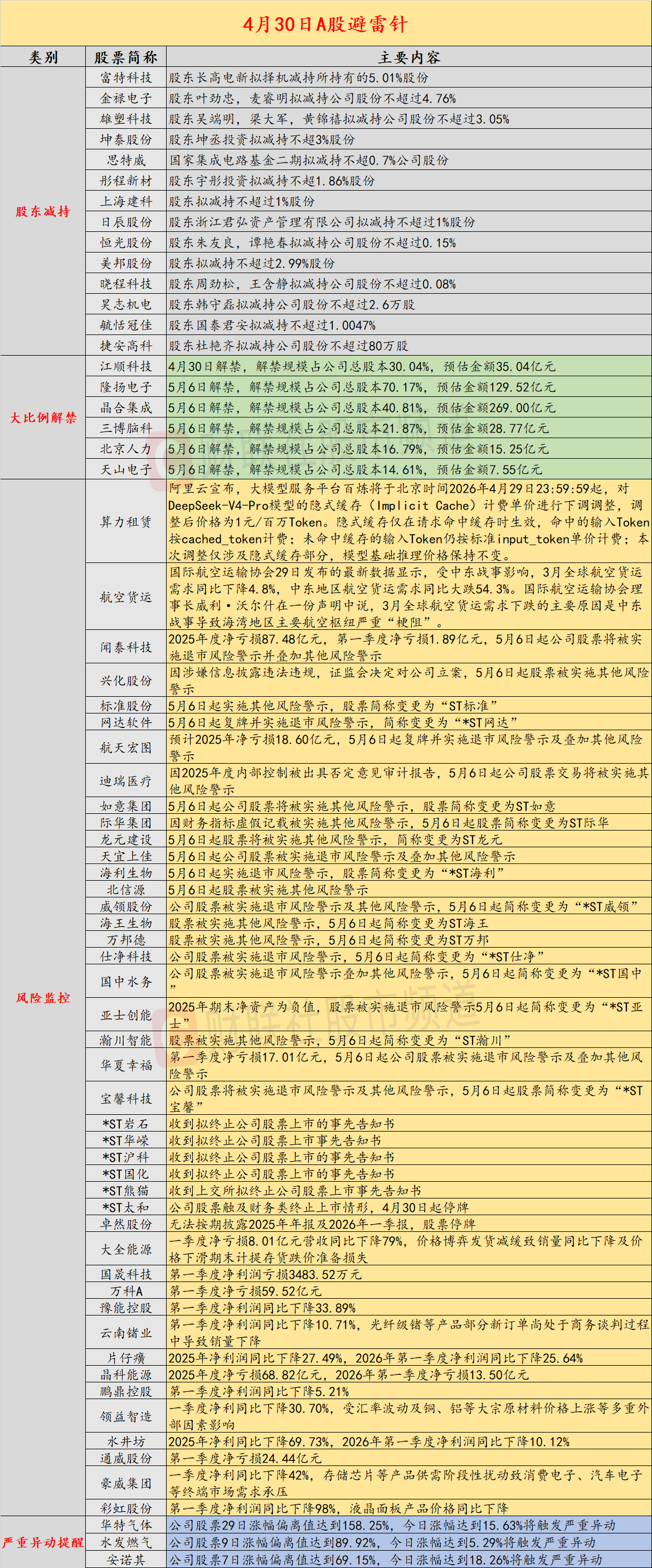 2026-04-30交易所,交易所排名,交易所排行,加密货币是什么,加密货币交易平台,加密货币平台,币安交易所,火币交易所,欧意交易所,Bybit,Coinbase,Bitget,Kraken,全球交易所排名,交易所排行导读:财联社4月30日投资避雷针,近日A股及海外市场潜在风险事件如下。国内经济信息方面包括:1)多家金店品牌金饰克价大幅回落;2)阿里云百炼宣布DeepSeek-V4-Pro模型隐式缓存降价;公司方面重点关注包括:1)闻泰科技2025年度净亏损87.48亿元,第一季度净亏损1.89亿元,5月6日起公司股票将被实施退市风险警示并叠加其他风险警示;2)*ST熊猫收到上交所拟终止公司股票上市事先告知书;海外市场重点关注包括:1)美股三大指数收盘涨跌不一,贵金属跌幅居前;2)美联储主席鲍威尔表示,支持转向中性偏向的官员人数有所增加,或许下次会议就会考虑改变目前的宽松倾向。